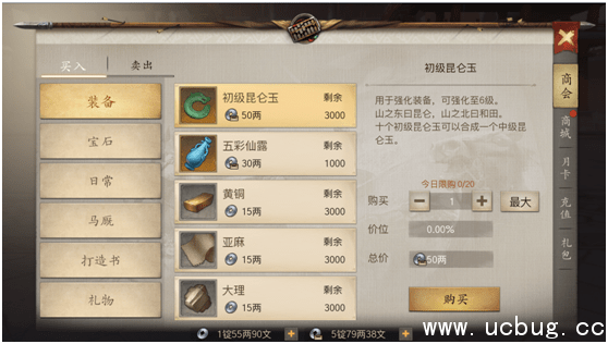 商会内出售大量装备打造材料,可使用银两购买。商会内的售价较高,推荐各位将军到摆摊采购其他将军出售的打造材料,或者自行到地图采集材料。