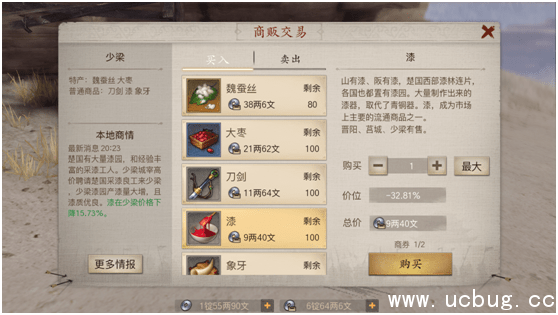每个城池的行商会贩卖不同的商品,分为特产、普通商品两种。特产单价较高,普通商品单价较低。只有在当地可购买的商品,才能在当地出售。