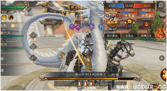 王城战的战斗在本国王城进行,目标是收集到尽可能多的民心。占领行政区和商业区可提高民心产出,而占领应龙则可以使民心产出速度变为原来的3倍。王城战持续时间20分钟,率先获得10万民心,或王城战结束时民心较高的一方帮派获得王城战胜利。