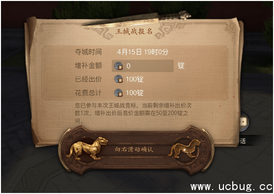 每天18:00之前,帮主前往应龙台旁王城郡守处进行王城战报名。竞价需要消耗50-200锭帮派资金。帮主有两次增补竞价机会,如果觉得竞价金额不足可以补充竞价,增补后总额不超过200锭。