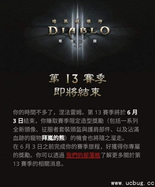 5月18日,不少玩家都收到了由台服官方发送的关于第十三赛季结束时间的邮件,在邮件中表明第十三赛季将于6月3日结束,第十四赛季将在6月16日开始。下面斜杠小编就带大家一起来看看暗黑3第14赛季开始时间吧。