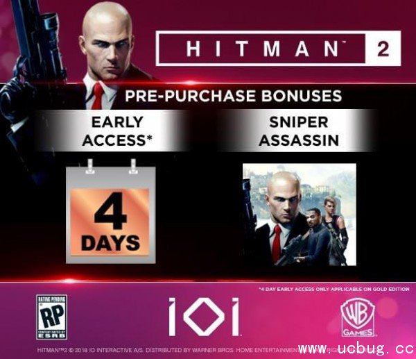预购奖励:提前4天获取游戏(仅限黄金版);《杀手:狙击手刺客》,现在预购就可以直接进入游玩,这是独立于《杀手2》亦包括其中的模式,可以单独下载。