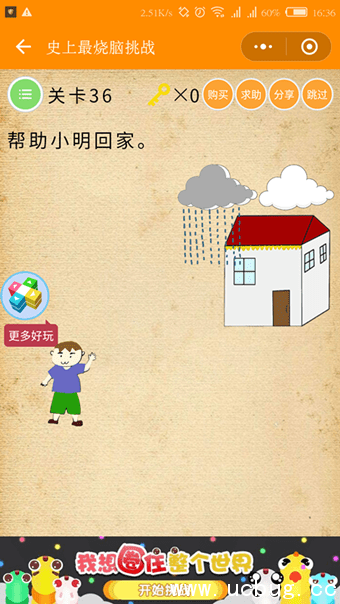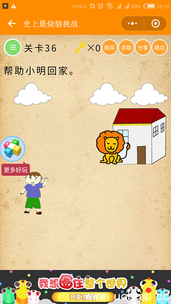 如何帮助小明回家?微信小程序史上最烧脑挑战第36关怎么过?如何让家门口有狮子的小明回到家中呢?下面就来和斜杠小编一起看看怎么精简吧。