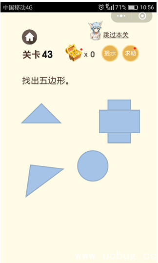 微信史上最烧脑游戏第43关是找出五边形。难度比较简单,那么微信史上最烧脑游戏第43关怎么过呢?下面斜杠小编将给大家带微信史上最烧脑游戏第43关答案。