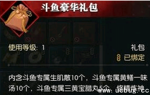内含斗鱼专属生肌散10个,斗鱼专属黄鳝一味汤10个,斗鱼专属三黄宝腊丸5个,修精炼神丹5个,钱袋5个