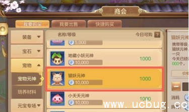 首先,需要一个普通的宠物,小编在【交易】-【商会】里面,随便购买了一个猫妖元神,当然购买的是普通的宠物,不是变异的,你想要买什么宠物都行。
