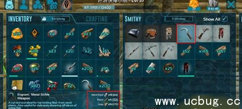 准备好材料后,我们需要到铁匠铺(20级解锁印痕的那个木桌)才能制作,把需要的材料放进铁匠铺里边,下方点制作,就可以了,有了镰刀,咱们采集纤维的速度就可以大大加快了。