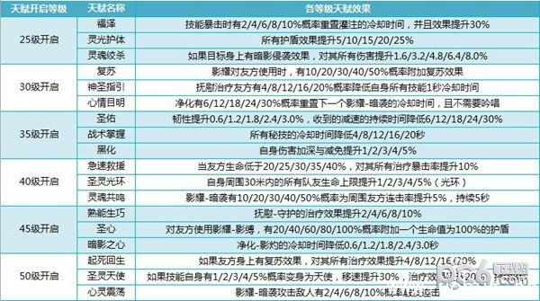 天赋是选择第二竖行,剩余十个天赋点加45和50级的第一个天赋,增加治疗量。