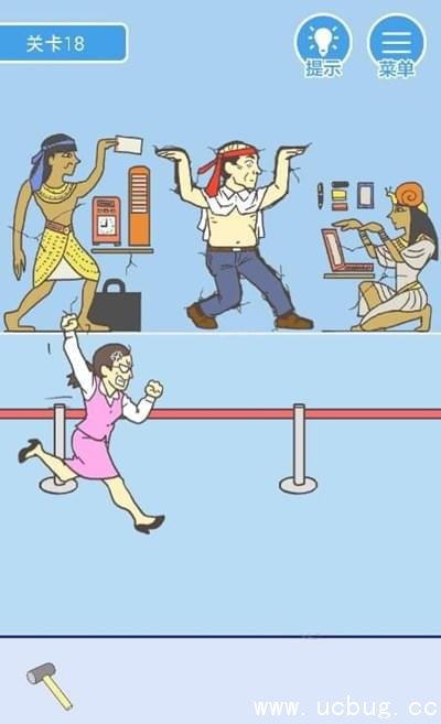 然后,我们移动画面到场景1,用锤子将墙面打破,