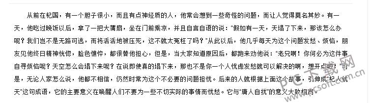 从前在杞国,有一个胆子很小,而且有点神经质的人,他常会想到一些奇怪的问题,而让人觉得莫名其妙。有一天,他吃过晚饭以后,拿了一把大蒲扇,坐在门前乘凉,并且自言自语地说:“假如有一天,天塌了下来,那该怎么办呢?我们岂不是无路可逃,而将活活地被压死,这不就太冤枉了吗?”