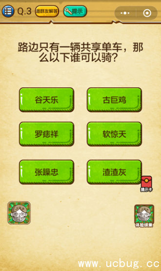 微信史上最强的大脑第3关怎么过 路边只有一辆共享单车那么以下谁可以骑