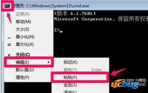 2、我们先复制:netsh winsock reset catalog,然后单击 "管理员命令" 窗口左上角的 "小" 框, 然后单击下拉菜单中的 "编辑粘贴"。