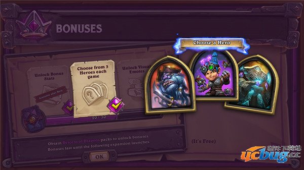 获取了20包卡牌包的玩家在游戏开始时可以选择的英雄从两位增加到三位。
