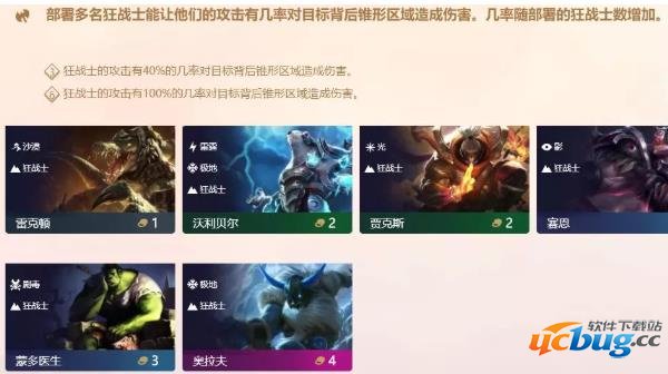 狂战士作为S2新加入的职业羁绊,羁绊效果是狂战士们会跳向离他最近的敌人,同时有几率对目标背后造成锥形伤害,有点类似于巨九的效果。