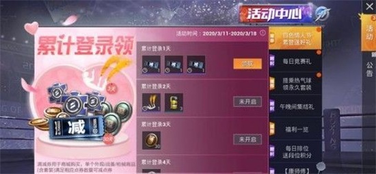 累计登录每天都可以得到不一样的奖励,奖励的内容还是比较丰富的,有限时尾迹、服饰币、物质币还有荣耀勋章碎片,不管是满减卷还是这些道具物品奖励都可以给玩家们带来惊喜,而且这些奖励只需要你登录游戏就可以领取,并不需要完成什么任务,可以说是非常划算的,目前白色情人节只开启了登陆领取满减券和其他奖励的活动,其他的活动目前还未开启,大家可以等待3月14日白色情人节的到来,说不定会有更多惊喜。