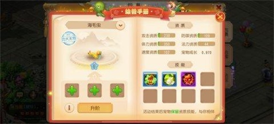 (2) 绘兽手册:少侠领养自己的海毛虫或大海龟后,可以在手册界面上使用绘梦水墨为其升阶、提升资质、学习新技能,最后还能将它变为自己真正的宠物。