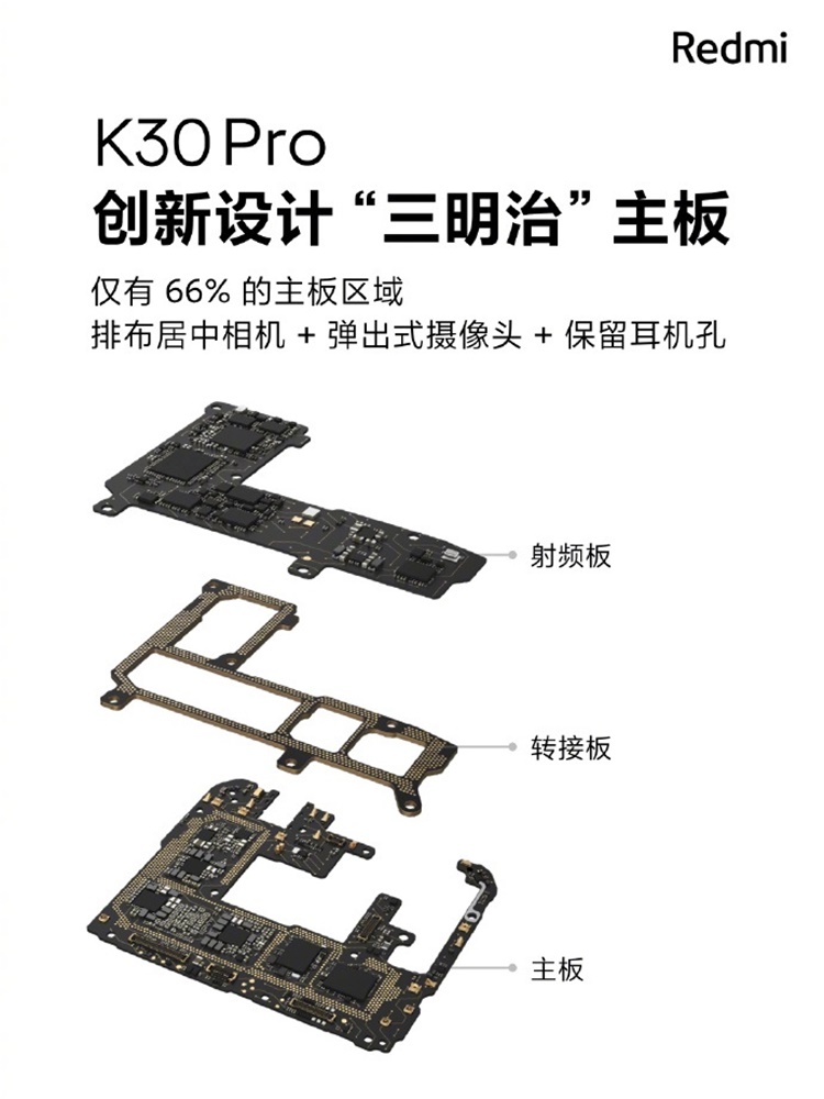 设计弹出式全面屏5G手机,元器件数量翻倍,升降结构和摄像头模组占用主板空间等挑战,Redmi K30 Pro采用了“三明治”主板设计,实现了超高集成度,并把电池做到了4700mAh,保证续航。