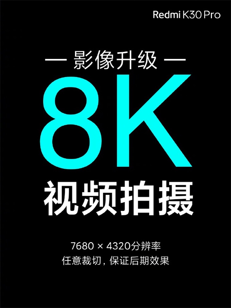 Redmi K30 Pro还支持8K视频录制,平滑变焦,双镜头接力启动;电影画幅,一键Vlog,魔法换天;支持自动适配云台,新增超级文档,身份证影印;搭载了2000万 前置AI美颜相机,120帧慢动作,支持延时拍摄。