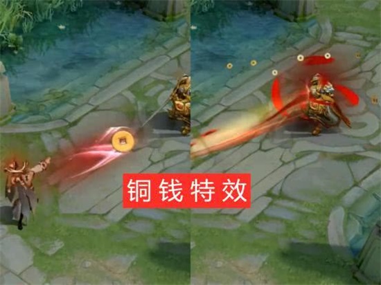 然后小明这款疑决卦皮肤的局内技能特效也是非常炫酷的,全部技能的特效里都有铜钱特效,还是非常符合他这个占卜者的身份设定的,因为他的12技能都是同一个形式的,所以整体的特效差别不大,使用技能的时候我们就可以看到一个大铜钱,然后后面还有红色的尾焰,当技能连接到队友的身上的时候,队友的头上也会出现暗红色的光效,然后还有很多铜钱在漂浮着。