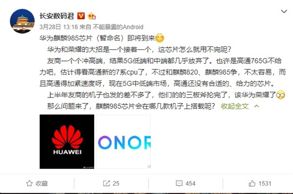 这里由斜杠下载站为您提供资讯服务的分享,在3月29日,华为官方突然发博华为麒麟 985 芯片即将到来的消息,这一消息一出,不禁让小编想起之前还未发布的华为麒麟985芯片的消息呢,(名称包括麒麟990和麒麟985)在2019年期间,曾因为关于新一代的麒麟处理器有争议问题,华为最终发布麒麟990和麒麟990 5G处理器,不见麒麟985处理器的消息,难道华为麒麟985处理器要在2020上线了吗。真是让人期待,下面小编就带大家去看看是怎么一回事吧。