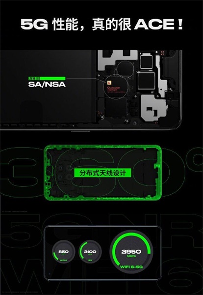 OPPO超级玩家Ace2拥有强悍配置与5G性能:①搭载高通骁龙865,最高拥有12GB LPDDR5内存,支持Turbo Write+HPB的UFS 3.0;②支持双模5G和全球超过25个国家/地区的漫游,360°分布式天线加持;③支持Wi-Fi6,可实现5G与 Wi-Fi 网速叠加,网速拉满情况下连接速度可达2950Mbps。