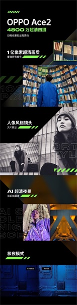 OPPO超级玩家Ace2后置搭载了4800万高清四摄。1亿像素超清画质功能,出片快,细节清晰;AI超清夜景功能,手持也可拍大片。前置1600万摄像头的人像中加入了暗光自拍功能,不论多晚,自拍都能做到亮处不过曝,细节不失真。