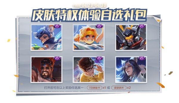 打开礼包可任意选择下列皮肤7日体验卡一张:李元芳-逐浪之夏、刘禅-天才门将、吕布-末日机甲、程咬金-功夫厨神、诸葛亮-黄金分割率、李白-千年之狐或者皮肤碎片*2。