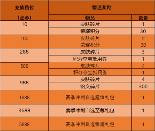 赛季冲刺自选荣耀礼包*1+赛季冲刺自选至尊礼包*1+赛季冲刺自选超值礼包*1+积分夺宝券*2+皮肤碎片*14+荣耀积分*60+铭文碎片*300
