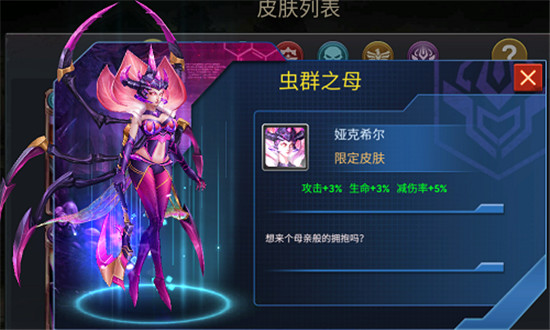 娅克希尔:娅克希尔限定皮肤虫群之母,属性加成攻击加百分之三,生命加百分之三。减伤率加百分之五。