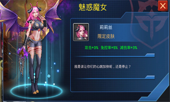 阿卡莎:阿卡莎限定皮肤魅惑魔女攻击加百分之三,免控率加百分之五,减伤率加百分之三。