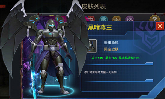 墨菲斯托:墨菲斯托限定皮肤墨菲斯托,攻击加百分之三,暴击加百分之五,暴击伤害值加百分之五。