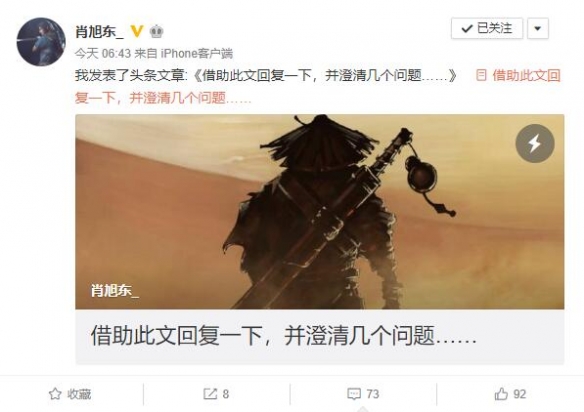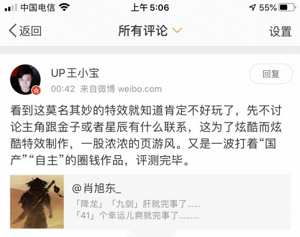 今日(5月15日),国产武侠紫塞秋风发布了一篇游戏的制作幕后故事,但是很多玩家还是对该游戏吐槽点太多,比如有的游戏玩家直接在微博上质疑游戏特效莫名其妙、游戏开发的目的就是圈钱,游戏画面太劣质,说好的是国产风,但是又加入了一些西部风格等等。现在小编带领大家看一下游戏玩家的各种吐槽和肖导的霸气回复。