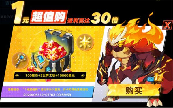 活动内容:参与1元超值购活动即可立即获得100星币+2个世界之钥+10000星光超进化钜壕福利!(温馨提示:该活动不计入首充、月卡和其他累充活动)