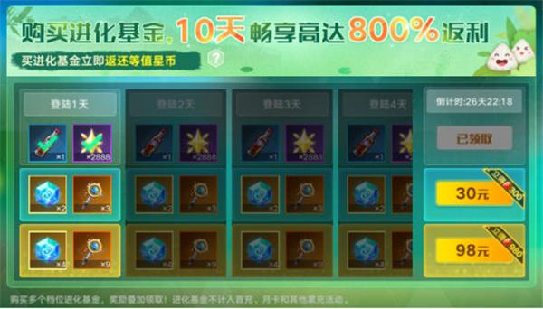 活动内容:进化基金活动上新!登陆游戏每天免费领取星光、快乐水超值福利,可免费领取10天!还有30、98元两档奥拉晶石、世界之钥总共高达返利800%的超值基金哦!(登陆游戏开启基金活动后,活动有效期为30天)