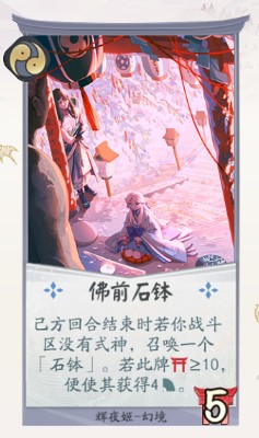 效果:己方回合结束时若你战斗区没有式神,召唤一个石钵。若此牌耐久≥10,便使其获得4攻击。