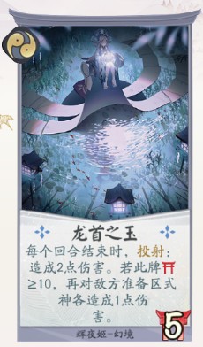 卡牌评价:依旧是耐久大于十效果更好的卡牌,可以投射2点伤害并且对准备区式神造成一点伤害,算是辉夜姬非常超模的一张牌了。