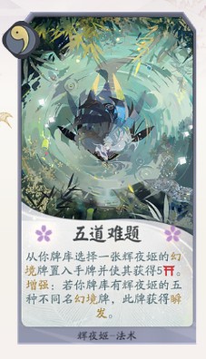 效果:从你牌库选择一张辉夜姬的幻境牌置入手牌并使其获得5耐久。【增强】若你牌库有辉夜姬的五种不同名幻境牌,此牌获得瞬发。