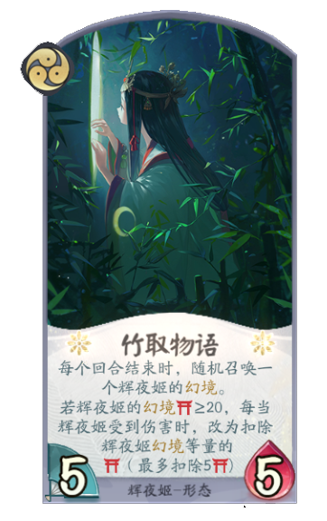 效果:每个回合结束时,随机召唤一个辉夜的幻境。若辉夜姬的幻境耐久≥20,她便免疫所有伤害。
