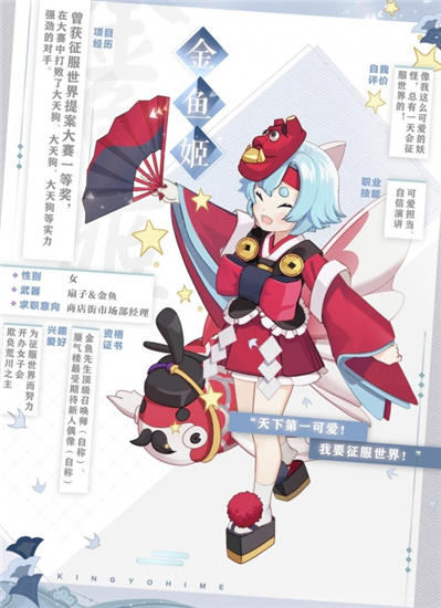 金鱼姬身怀金鱼召唤术,是蜃气楼的知名可爱担当。她使用的武器是金鱼和扇子。怀揣着金鱼无极召唤师资格证与蜃气楼最受期待新人偶像称号的她自信满满,自称是世界第一可爱担当,梦想是征服世界,开办女子会,“欺负”荒川之主!