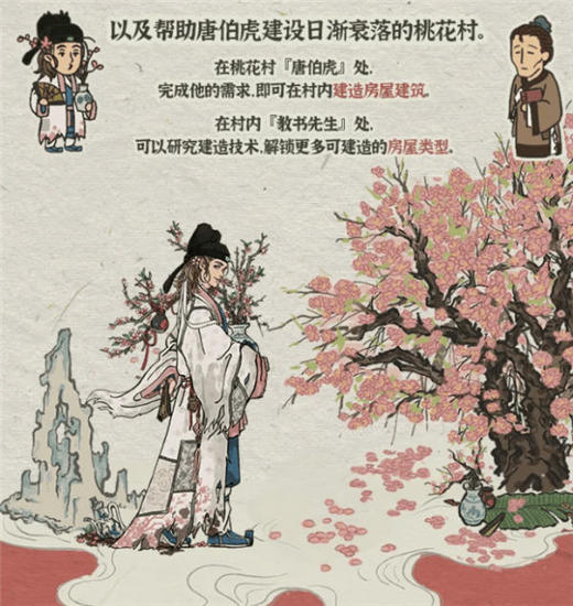 在桃花村唐伯虎处完成他的需求,即可在村内建造房屋建筑。