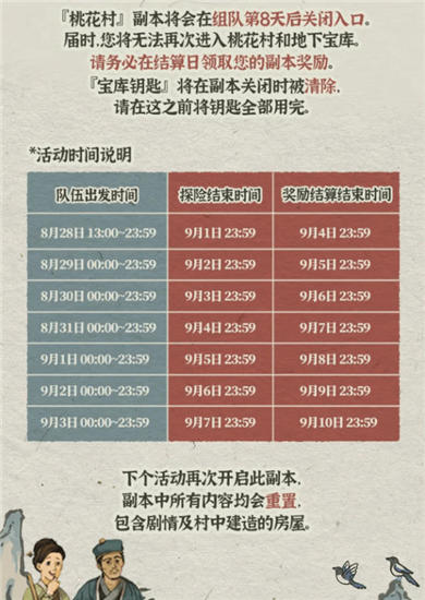「桃花村J副本将会在组队第8天后关闭入口。届时您将无法再次进入桃花村和地下宝库。请务必在结算日领取您的副本奖励。「宝库钥匙」将在副本关闭时被清除,请在这之前将钥匙全部用完。