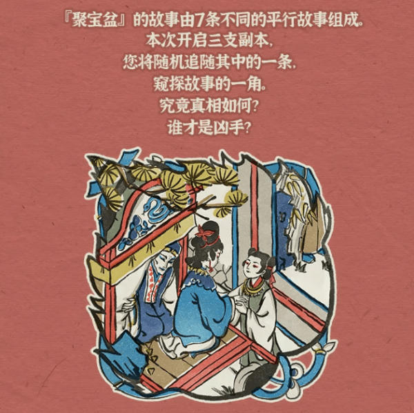 「聚宝盆」的故事由7条不同的平行故事组成。本次开启三支副本,您将随机追随其中的一-条,窥探故事的一角。究竟真相如何?谁才是凶手?