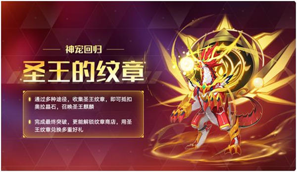 圣王麒麟的神宠回归中,将开启圣王纹章限时收集活动。活动期间,小奥拉可通过领取每日任务宝箱来获得圣王纹章,纹章可在圣王麒麟神宠回归活动中用于抵扣奥拉晶石,助力小奥拉获得圣王麒麟。此外,活动期间完成圣王麒麟最终突破后,还将解锁圣王麒麟纹章商店,可使用圣王纹章兑换多重好礼。
