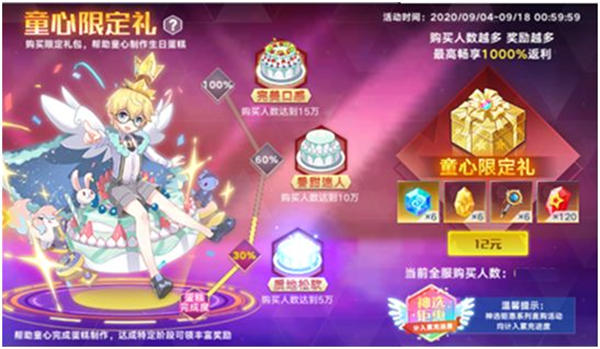 活动内容:童心限定礼上架,超值限定礼包,仅限购买一次。礼包购买人数越多,则可领取更多更丰厚的进度奖励哟!