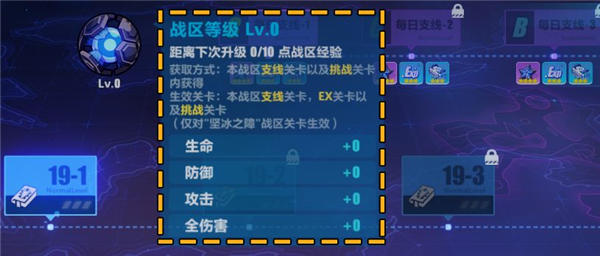 主线十九章共分为三个战区,每个战区都由三个部分组成:分别为主线剧情关卡、每日支线关卡及每日挑战关卡。