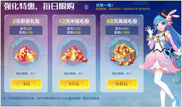 活动内容:强化每日特惠开启~每日即可以巨优惠价格直购获得大量星币与星能资源。机会难得,不容错过,快去强化你的亚比装备吧~(温馨提示:每日特惠直购礼包不计入累充进度)
