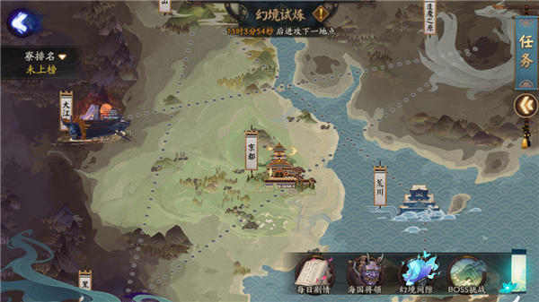 ※活动开启时,大人们可从庭院进入活动界面。幻境中除了再现了海国之征的行进地图外,还包含了海国将领、幻境间隙、BOSS挑战和每日剧情等入口。备战期间大人们只可参与海国将领和幻境间隙2种玩法;而进攻期则可体验全部玩法;