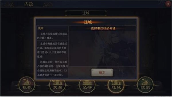 玩家可以通过迁城的功能,将主城迁移至分城的位置,来达到调整主城位置的目的。