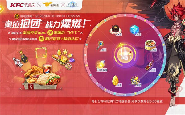 活动时间:9月18日0点—9月30日停服维护前活动内容:奥拉抱团,战力爆燃!联动活动二:KFC宅急送x美团x奥拉星联动福利转盘。活动期间,奥拉星手游联动开启惊喜福利大转盘!转盘奖励包括奥拉晶石、祈愿石、世界之钥、王者天赋精华、幽幕夜曲、满汉全席等珍贵道具,小奥拉们每日成功分享KFC宅急送x美团x奥拉星联动宣传海报,即可领取1次抽奖机会,抽取联动福利奖励!