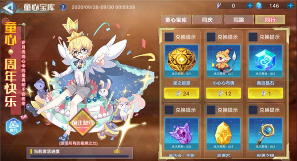 活动内容:同行宝库开启兑换~~精美装扮[小心心布偶]、星之起源等一系列珍贵奖励等你兑换。快去收集时光碎片,把所需资源搬回家吧!
